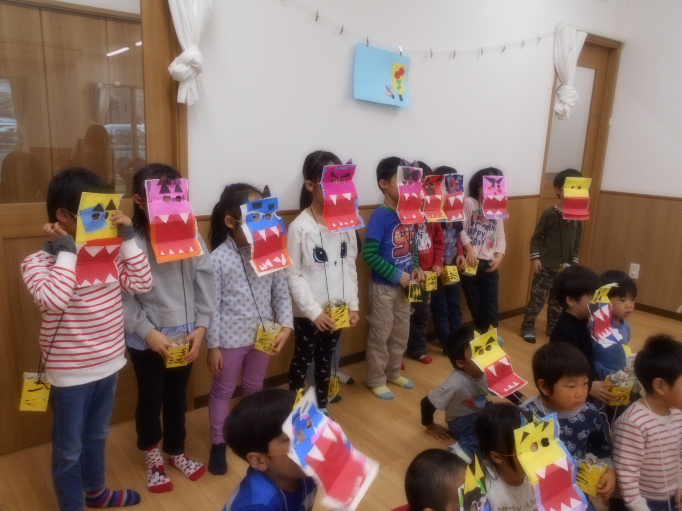 各クラスで鬼👹のお面と豆入れを作り、当日の豆まきに備えていました。