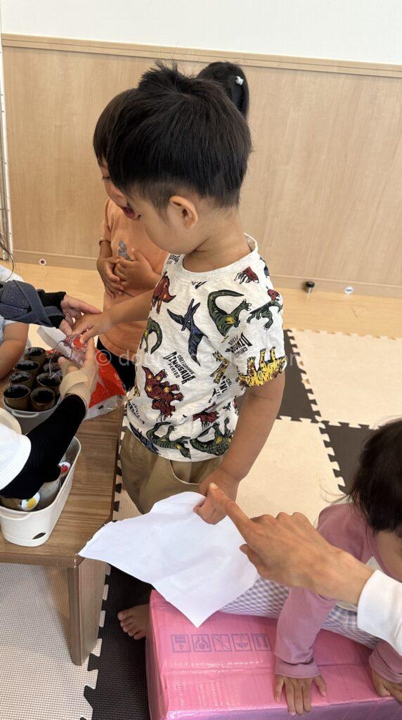 童夢ガーデン柏保育園はマンションの1階にあり、マンションのテラスに鉢などを置いてはいけないので、なんとか保育室でも育てられないか考え、小さな一人ずつのプランターを作って、そこで栽培してみることにしました!