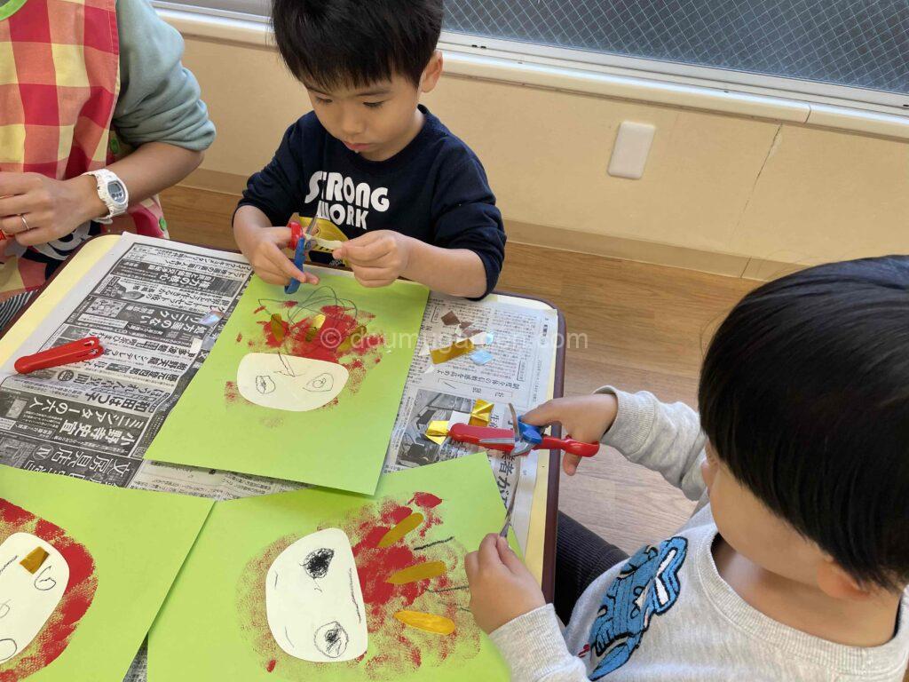 制作では、2歳児さんは、ハサミを使ってだるま作り。ハサミの使い方も上手になってきました。