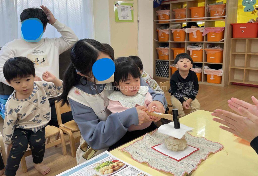 まずは鏡開き。年末に飾った鏡餅、つるつるだったお餅が日が経つにつれて乾燥し、ひび割れしてきました。そんなお餅の変化を観察後、鏡開きの説明。