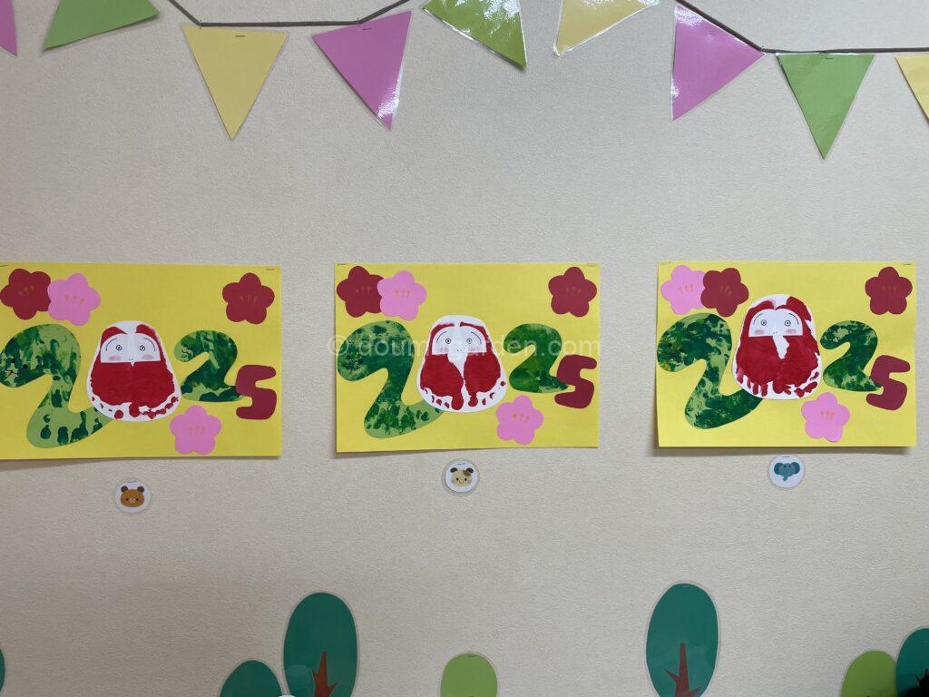 0歳児さんはフィンガーペイントと年号、足形でだるまさんを作りました。