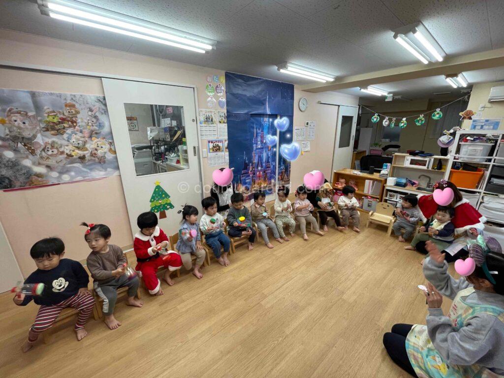 「サンタさんだー」と喜ぶ子もいれば、驚いて固まってしまう子がいたり、反応は様々でしたが(笑)みんなサンタさんに興味津々!