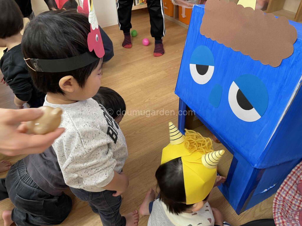 大きなお口をあけた鬼さんに、みんなでボールを「ポイッ!」と投げ入れます。 「おなかいっぱいになったかな?」と、夢中になって楽しんでいました。