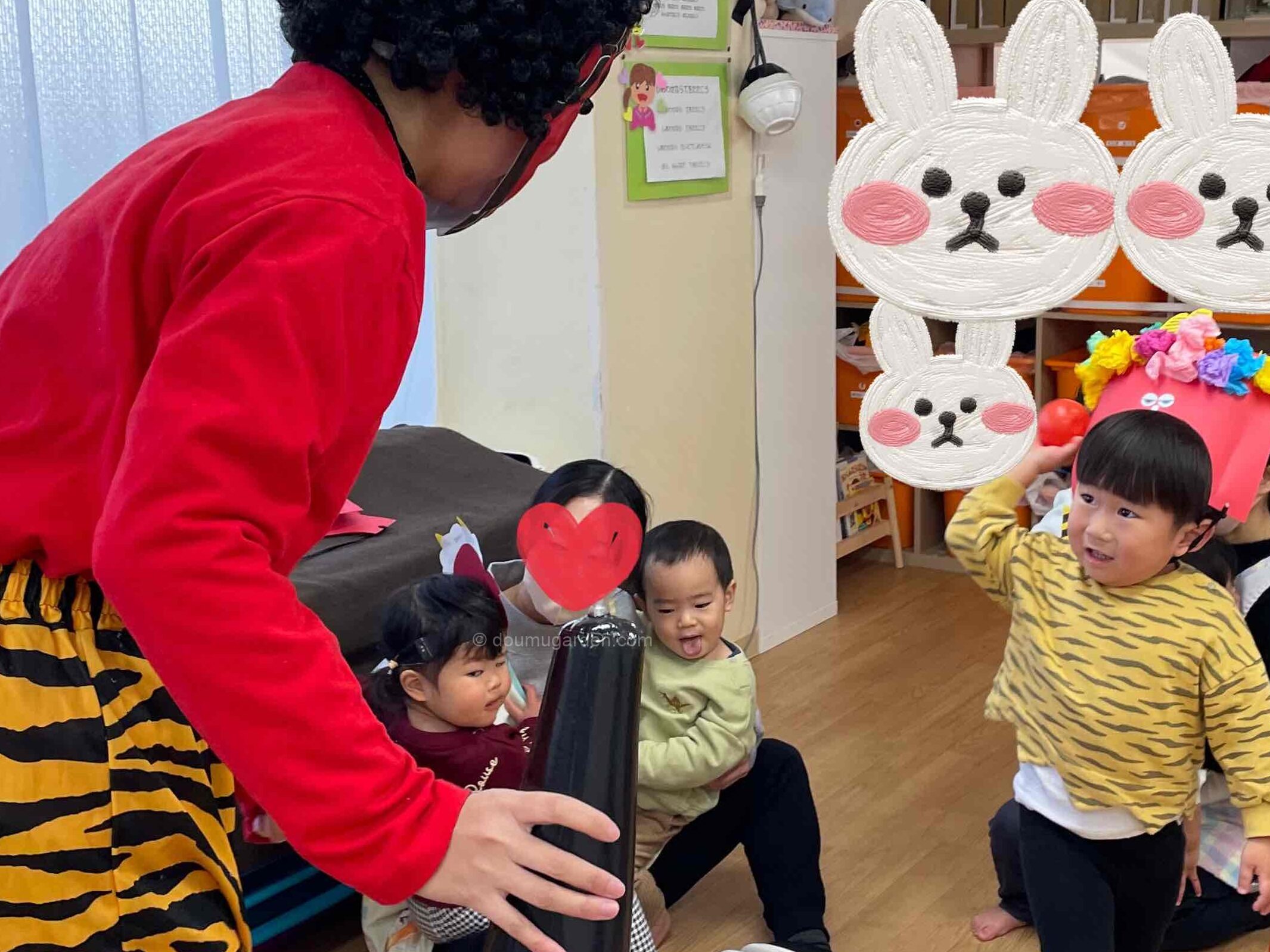 突然の登場に子どもたちはびっくり。泣き出してしまう子や、先生の後ろにギュッと隠れる子もいて、室内は一気に緊張感に包まれました。