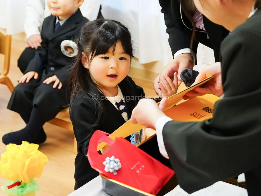 卒園式では、名前を呼ばれると少し照れながらも「はい」とお返事をし、保育者から卒園証書を受け取る姿に、大きな成長を感じました。温かくやわらかな雰囲気の中、子どもたちらしい素敵な時間となりました。