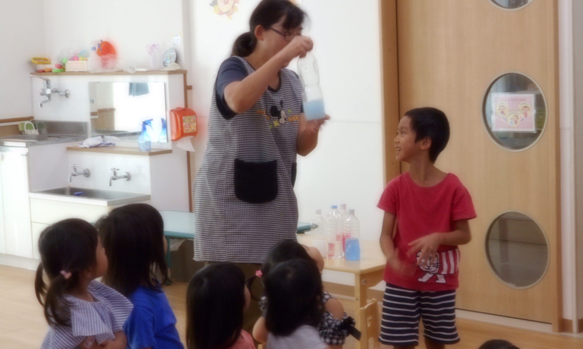 今回は先月の誕生会🎂の様子が届いたのでお伝えします。 9月生まれの園児は前によばれてマジシャンになりました。 魔法の言葉で透明な水に魔法をかけると… 「あんどら いんどら うんどら」 あら 不思議✨ 普通の水が色水に!! …